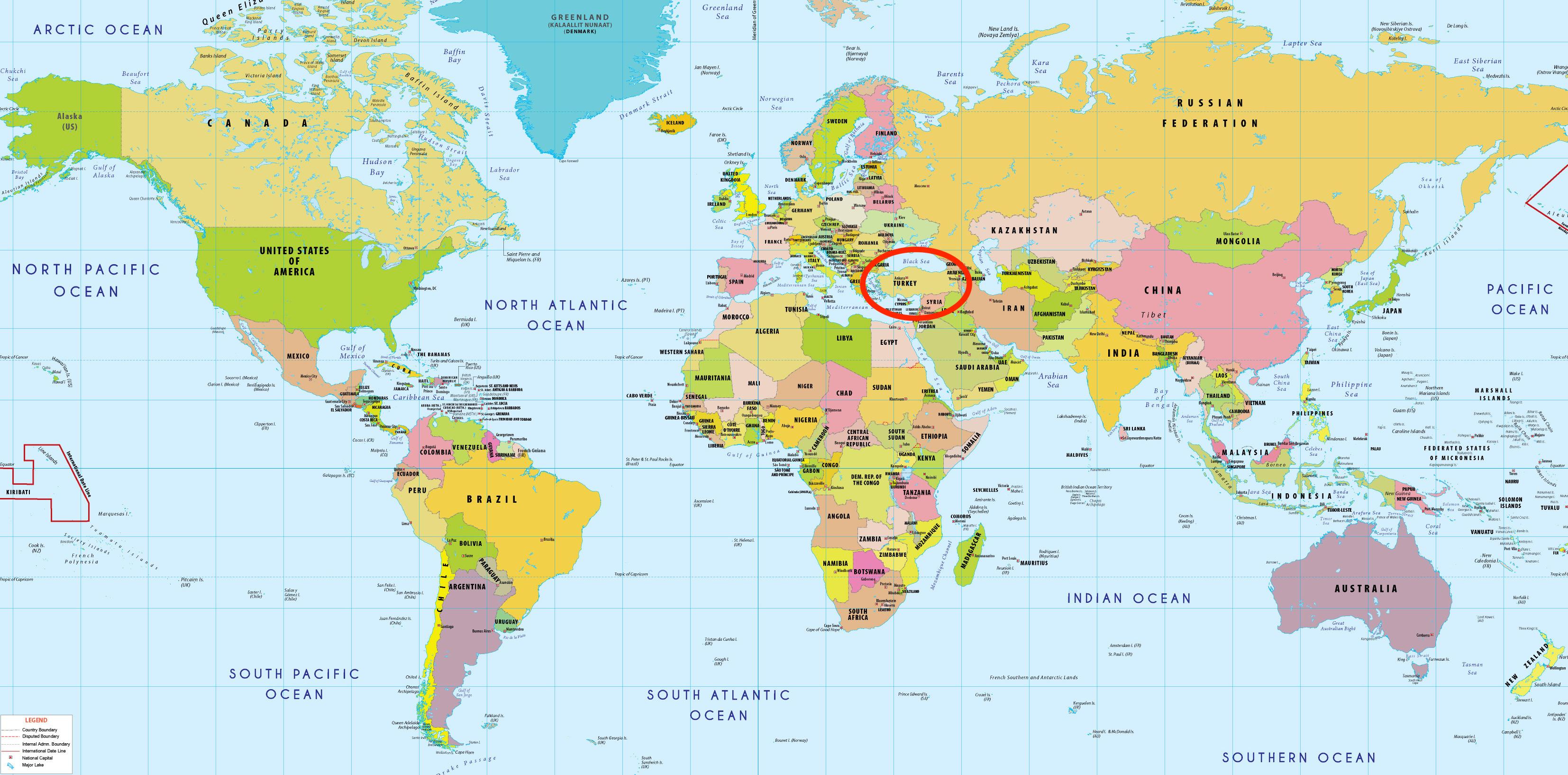 湖を含むトルコの面積は783,562平方キロメートル(300,948平方mi)で、そのうち755,688平方キロメートル(291,773平方mi)が南西アジアに、23,764平方キロメートル(9,174平方mi)がヨーロッパにあることは、世界地図のトルコを見ればわかる。トルコの面積は世界で37番目に大きい国です。西はエーゲ海、北は黒海、南は地中海と、三方を海に囲まれた国です。